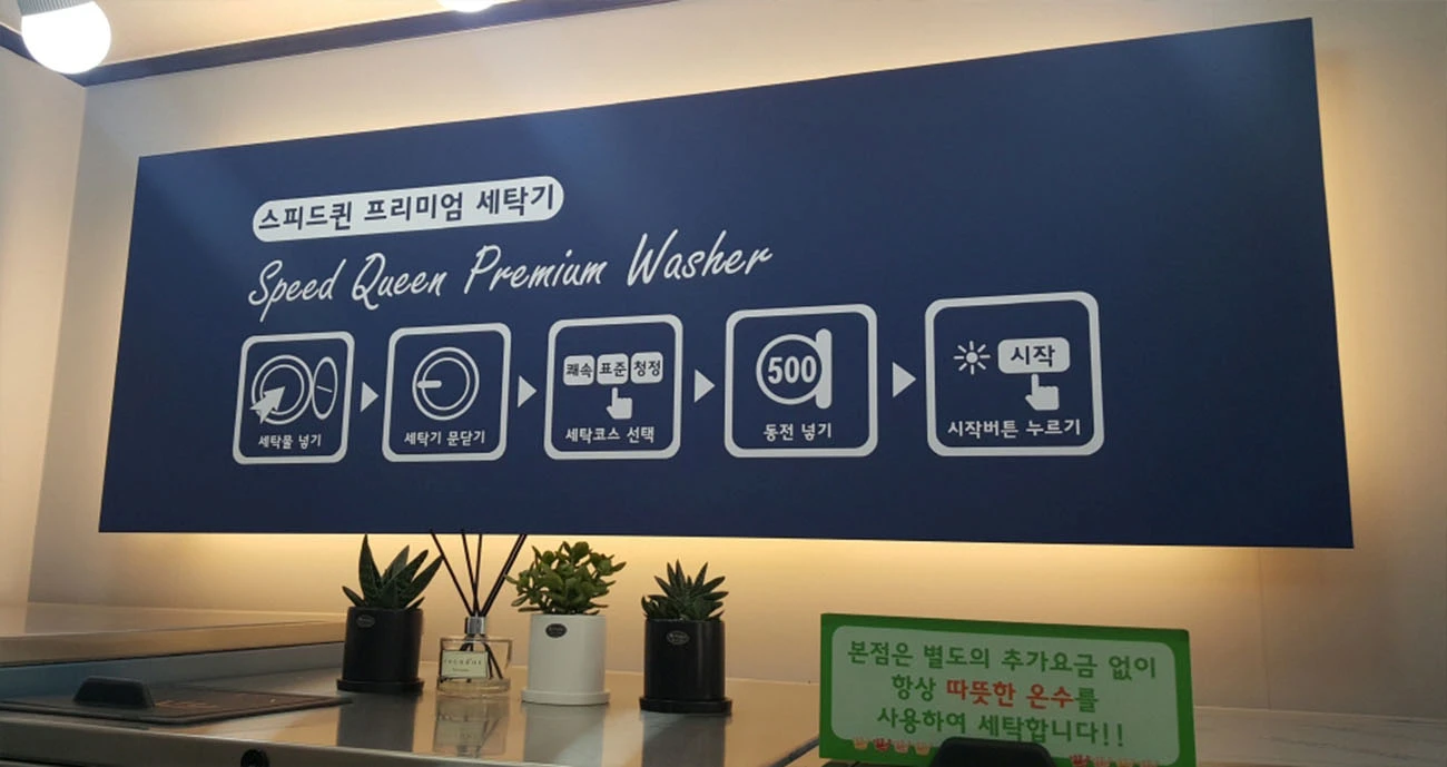 상가 면적 평수는 약 10평으로 다소 빠듯한 편이지만 2단 건조기를 조합함으로써 손님들 이용 공간을 부족하지 않게 확보할 수 있었습니다.