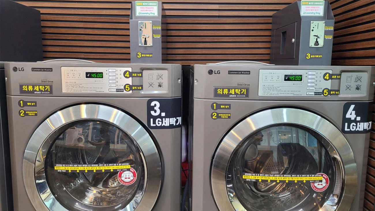 이곳 빨래방의 세탁기는 국산 대형세탁기와 LG 빨래방 세탁기를 사용하여 층간소음에 대한 부분을 해결했습니다.